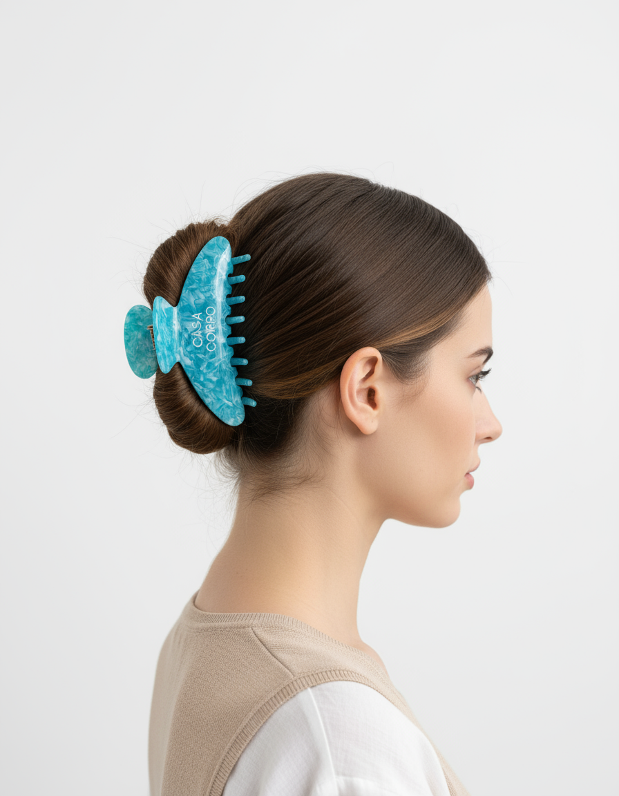 Unsere Casa Corpo Haarklammer in Blau gemustert hält dein Haar zuverlässig beim Pilates, beim Kaffee danach und bei allem dazwischen. Minimalistisch im Design, stark in der Funktion. Leicht, langlebig und mit einem Look, der zu jeder Bewegung passt.